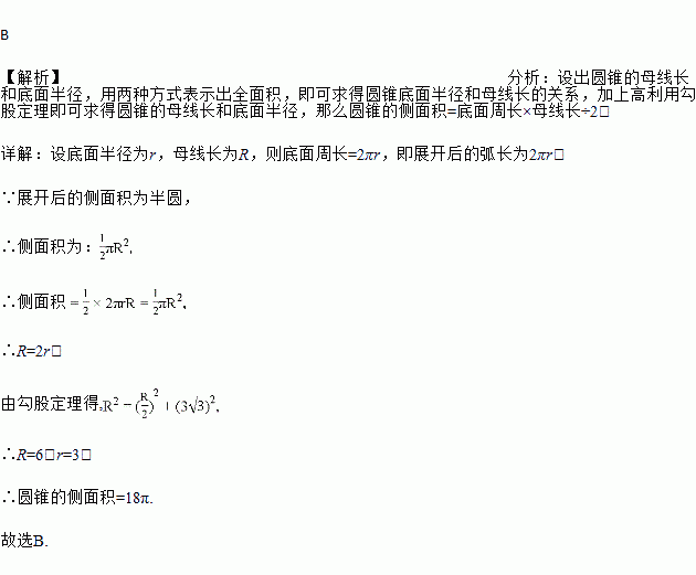 一个圆锥形工艺品,它的高为3cm,侧面展开图是半圆.则此圆锥的侧面积是( )