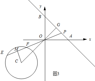 (3)图3中,当直线PO与⊙C相交时,设交点为E、F,如果CM⊥EF于点M,令PO=x,MO=y,求y与x之间的函数关系式,写出x的取值范围.