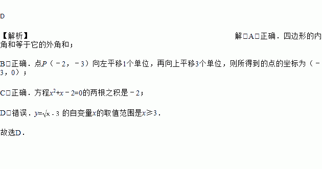 B. 点P(﹣2,﹣3)向左平移1个单位,再向上平移3个单位,则所得到的点的坐标为(﹣3,0)