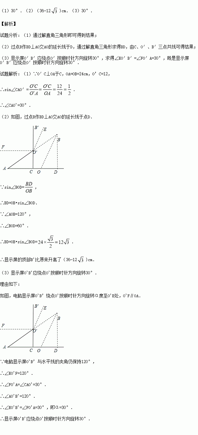 (3)如图4,垫入散热架后,要使显示屏O′B′与水平线的夹角仍保持120°,则显示屏O′B′应绕点O′按顺时针方向旋转多少度?