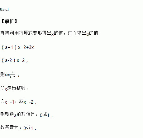 在等式(a+1)x=2+3x中,若x是负整数,则整数a的取值是________.