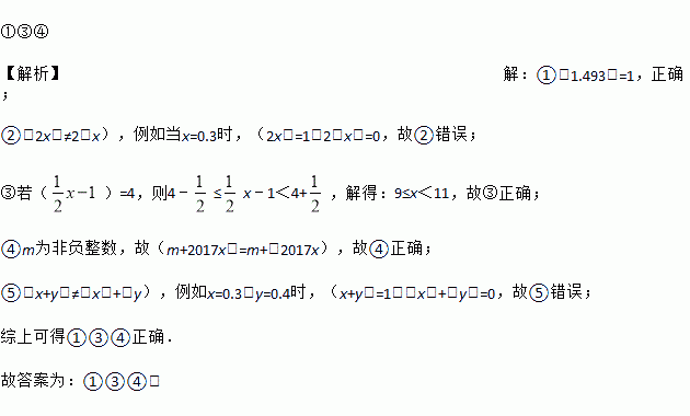 ①③④ 【解析】【解析】 ①(1.493)=1,正确; ②(2x)≠2(x),例如当x=0.3时,(2x)=1,2(x)=0,故②错误; ③若()=4,则4﹣≤x﹣1<4+,解得:9≤x<11,故③正确; ④m为非负整数,故(m+2017x)=m+(2017x),故④正确; ⑤(x+y)≠(x)+(y),例如x=0.3,y=0.4时,(x+y)=1,(x)+(y)=...