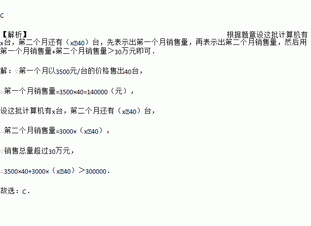 电脑公司销售一批计算机,第一个月以3500元/台的价格售出40台,第二个月起降价,以3000元/台的价格将这批计算机全部售出,销售总额超过30万元,则这批计算机最少有多少台?若设这批计算机有x台,则下列不等式表示正确的是( )