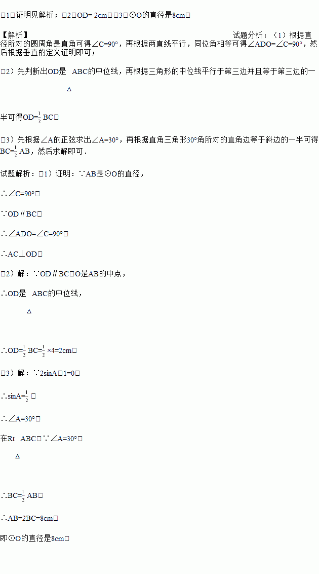 如图,已知AB为⊙O的直径,AC为弦,OD∥BC,交AC于D,BC=4cm.