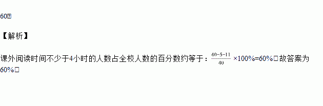 为了解我市某学校“书香校园”的建设情况,检查组在该校随机抽取40名学生,调查了解他们一周阅读课外书籍的时间,并将调查结果绘制成如图的频数直方图(每小组的时间值包含最小值,不包含最大值),根据图中信息估计该校学生一周课外阅读时间不少于4小时的人数占全校人数的百分数约等于________.