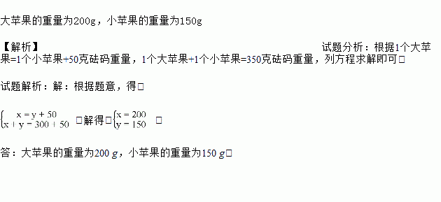 小张把两个大小不同的苹果放到天平上称,当天平保持平衡时的砝码重量如图所示.问:这两个苹果的重量分别为多少g?