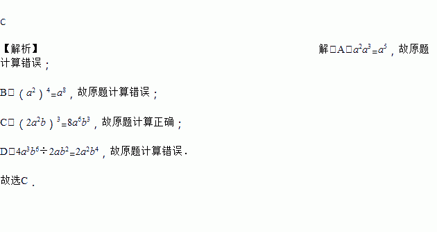 A. a2•a3=a6 B. (a2)4=a6 C. (2a2b)3=8a6b3 D. 4a3b6÷2ab2=2a2b3