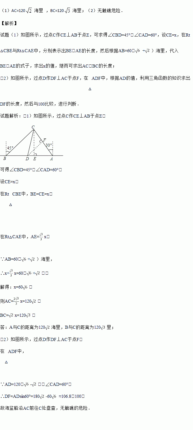 (2)已知在灯塔D周围100海里范围内有暗礁群,我在A处海监船沿AC前往C处盘查,途中有无触礁的危险?