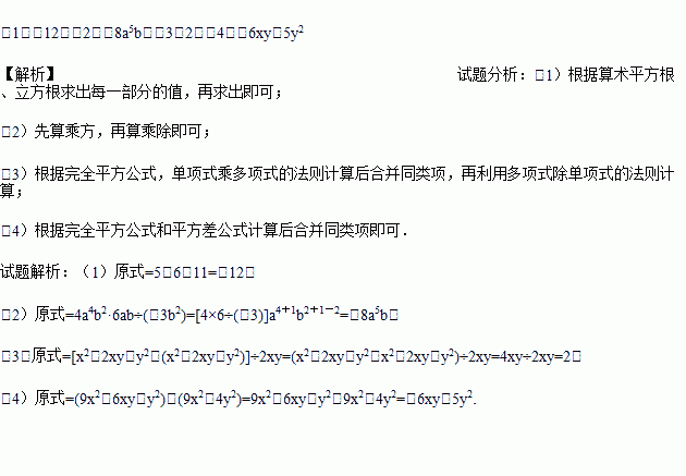 (3)[(x+y)2-(x-y)2]÷2xy; (4)(3x-y)2-(3x+2y)(3x-2y).