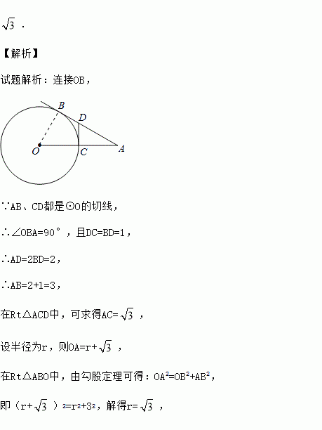 如图,AB是⊙O的切线,切点为B,AO交⊙O于点C,过点C的切线交AB于点D.若AD=2BD,CD=1,则⊙O的半径为 .