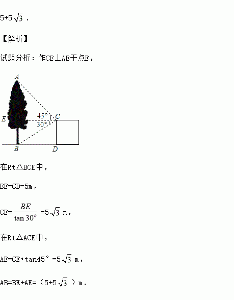 如图,在建筑平台CD的顶部C处,测得大树AB的顶部A的仰角为45°,测得大树AB的底部B的俯角为30°,已知平台CD的高度为5m,则大树的高度为 m(结果保留根号)