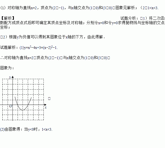 (1) 对称轴为直线x=2,顶点为(2,?1),与x轴交点为(1,0)和(3,0),图象见解析;(2)1