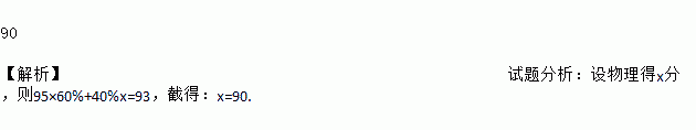 某大学自主招生考试只考数学和物理,计算综合得分时,按数学占60%,物理点40%计算.已知孔明数学得分为95分,综合得分为93分,那么孔明物理得分是__________分.