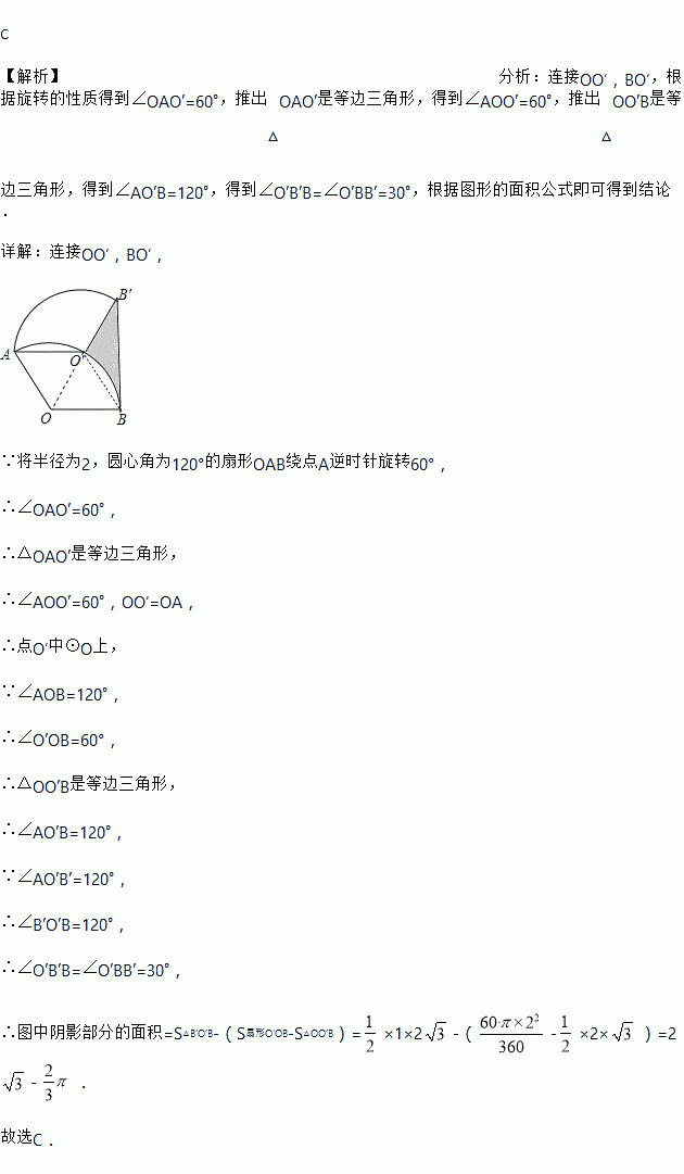 如图,将半径为2,圆心角为的扇形OAB绕点A逆时针旋转,点O,B的对应点分别为, ,连接,则图中阴影部分的面积是