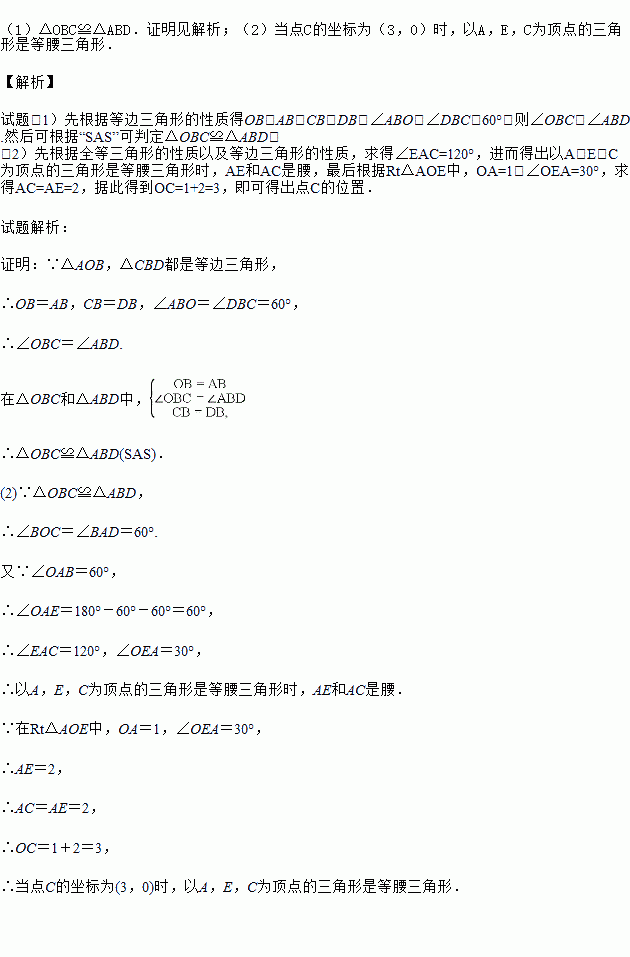 如图,在平面直角坐标系中,点A的坐标为(1,0),以线段OA为边在第四象限内作等边三角形AOB,点C为x正半轴上一动点(OC>1),连接BC,以线段BC为边在第四象限内作等边△CBD,连接DA并延长,交y轴于点E.