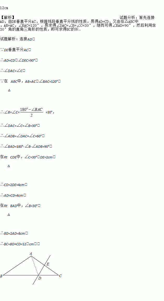 如图,在△ABC中,AB=AC,∠BAC=120°,DE垂直平分AC,交BC于D,交AC于E,且DE=2cm,求BC的长.