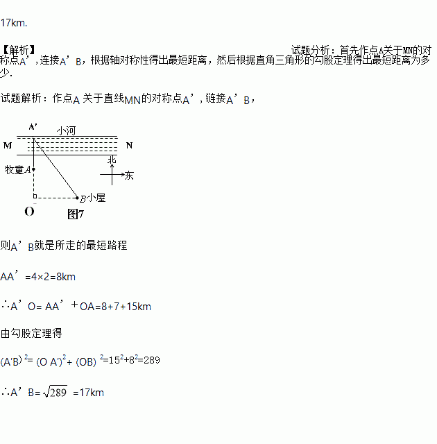 如图,一个牧童在小河的南4km的A处牧马,而他正位于他的小屋B的西8km,北7km处,他想把他的马牵到小河边去饮水,然后回家.他要完成这件事情所走的最短路程是多少?