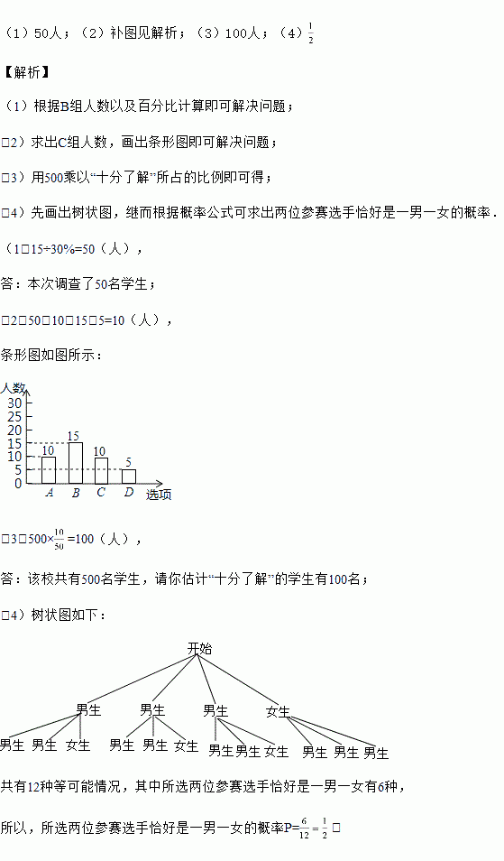 (4)在被调查“十分了解”的学生中有四名学生会干部,他们中有3名男生和1名女生,学校想从这4人中任选两人做家乡旅游品牌宣传员,请用列表或画树状图法求出被选中的两人恰好是一男一女的概率.