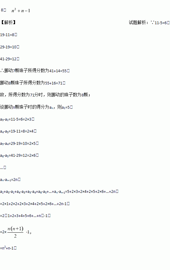 按表中规律,当所得分数为71时,则挪动的珠子数为_____颗;当挪动n颗珠子时(n为大于1的整数),所得分数为_______(用含n的代数式表示)。