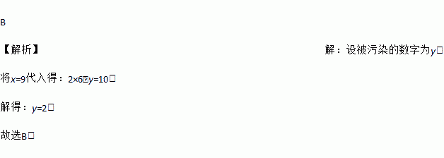 B 【解析】【解析】 设被污染的数字为y. 将x=9代入得:2×6﹣y=10. 解得:y=2. 故选B.