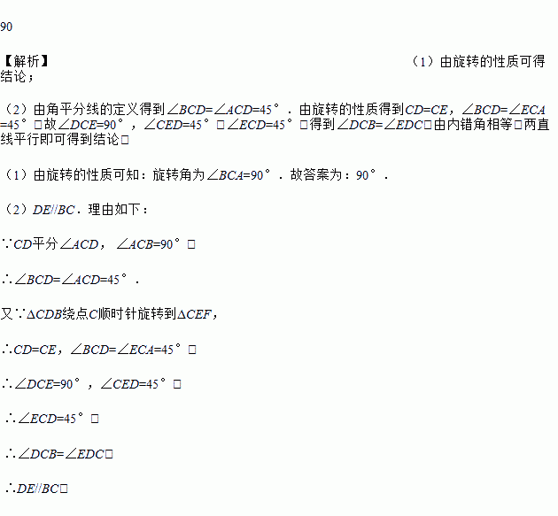 交AB于点D,将△CDB绕点C顺时针旋转到△CEF的位置,点F在AC上.![]()