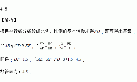 如图,已知AD、BC相交于点O,AB∥CD∥EF,如果CE=2,EB=4,AF=3,那么AD=_____.