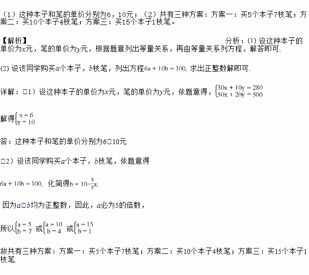 某同学准备购买笔和本子送给农村希望小学的同学,在市场上了解到购买某种本子30个和某种笔10支共需280元;购买某种本子50个和某种笔20枝共需500元。