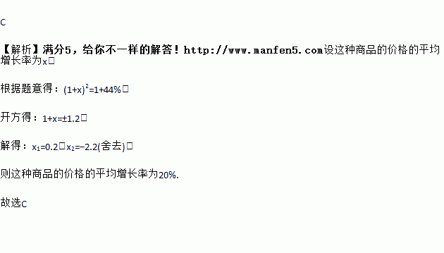 某种商品经过连续两次涨价后的价格比原来上涨了44%,则这种商品的价格的平均增长率是( )