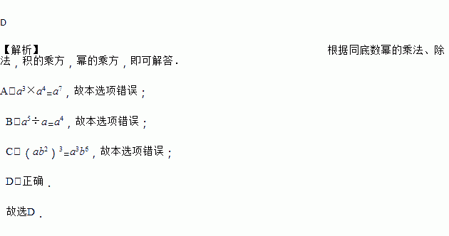 C. (3x2y)2=6x4y2 D. (﹣m)7÷(﹣m)2=﹣m5