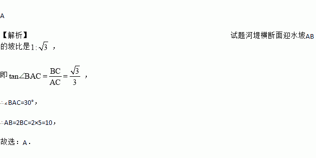 如图所示,河堤横断面迎水坡AB的坡比是1: ,堤高BC=5m,则坡面AB的长度是( )