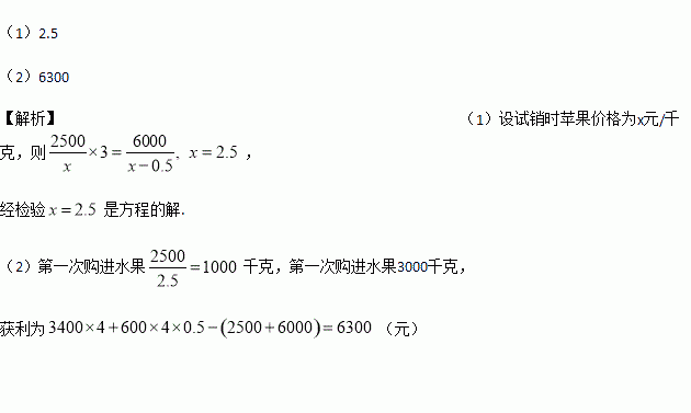 黄商超市用2500元购进某种品牌苹果进行试销,由于销售状况良好,超市又调拨6000元资金购进该品牌苹果,但这次进货价比上次每千克少0.5元,购进苹果的数量是上次的3倍.
