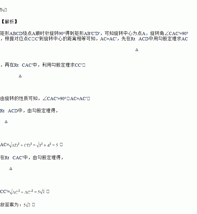 如图,将矩形ABCD绕点A顺时针旋转90°后,得到矩形AB′C′D,若CD=4,AD=3,连接CC′,那么CC′的长是______ .