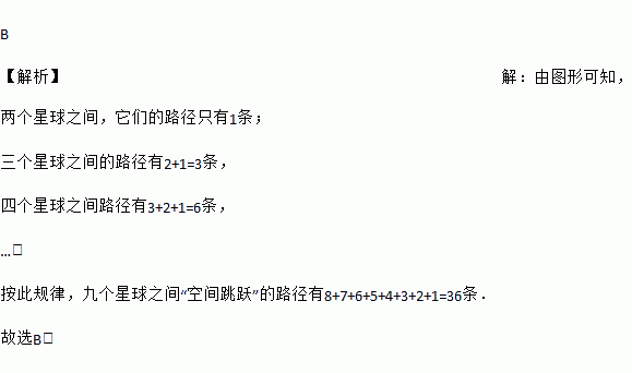 B 【解析】【解析】 由图形可知, 两个星球之间,它们的路径只有1条; 三个星球之间的路径有2+1=3条, 四个星球之间路径有3+2+1=6条, …, 按此规律,九个星球之间“空间跳跃”的路径有8+7+6+5+4+3+2+1=36条. 故选B.