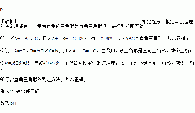 下列说法:①如果∠A+∠B=∠C,那么△ABC是直角三角形;②如果∠A∶∠B∶∠C=1∶2∶3,那么△ABC是直角三角形;③如果三角形的三边长分别为4,4,6,那么这个三角形不是直角三角形;④有一个角是直角的三角形是直角三角形.其中正确的有( )