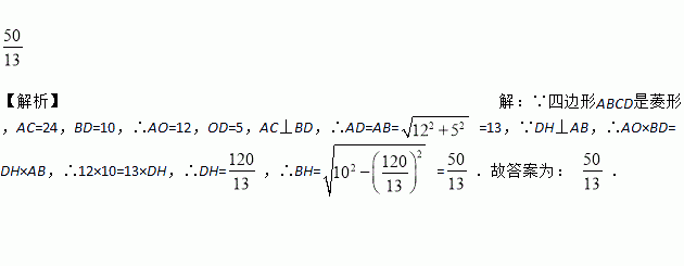 如图,四边形ABCD是菱形,AC=24,BD=10,DH⊥AB于点H,则线段BH的长为______.