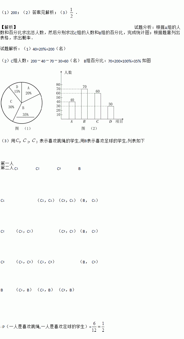 (1)200;(2)答案见解析;(3). 【解析】试题分析:根据A组的人数和百分比求出总人数,然后分别求出C组的人数和B组的百分比,完成统计图;根据题意列出表格,求出概率. 试题解析:(1)40÷20%=200(名) (2)C组人数:200-40-70-30=60(名) B组百分比:70÷200×100%=35% 如图 (3)用表示喜欢跳绳的学生,用B表示喜欢足球的学生,列...