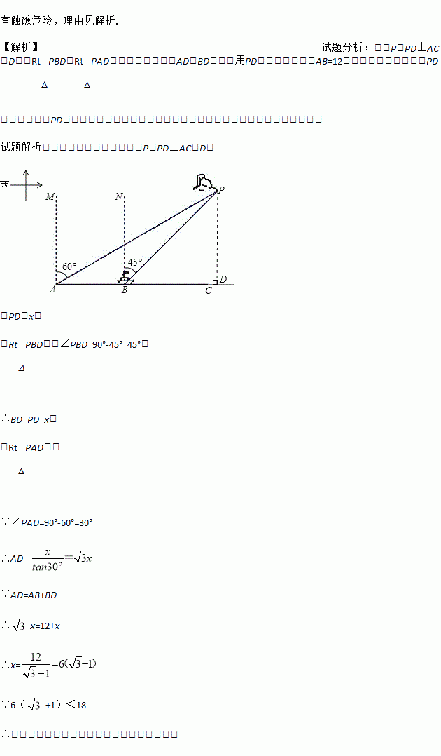 海中有一个小岛P,它的周围18海里内有暗礁,渔船跟踪鱼群由西向东航行,在点A测得小岛P在北偏东60°方向上,航行12海里到达B点,这时测得小岛P在北偏东45°方向上.如果渔船不改变航线继续向东航行,有没有触礁危险?请说明理由.