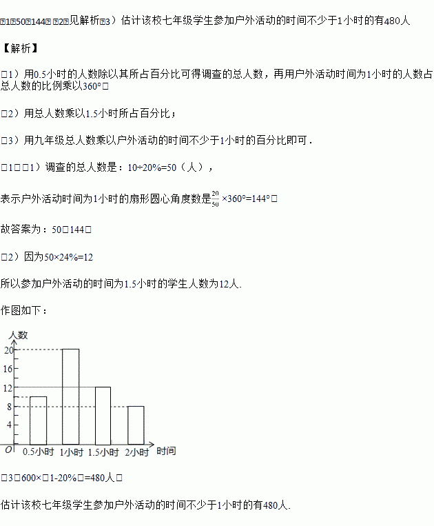 (3)若该校七年级有学生600人,请估计该校七年级学生参加户外活动的时间不少于1小时的有多少人?