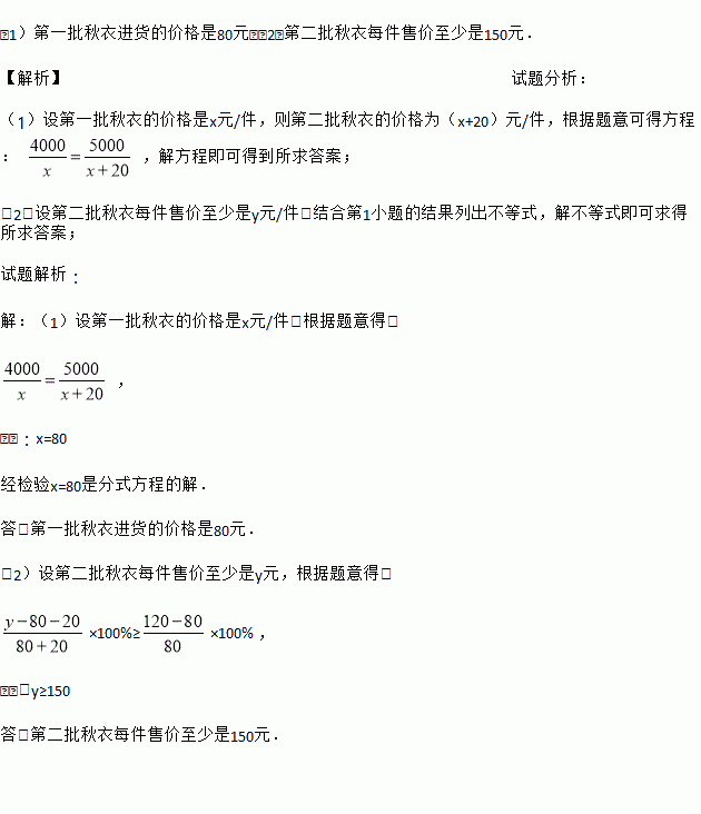 江津某服装店今年9月用4000元购进了一款秋衣若干件,上市后很快售完,服装店于10月初又购进同样数量的该款秋衣,由于第二批衬衣进货时价格比第一批衬衣进货时价格提高了20元,结果第二批衬衣进货用了5000元