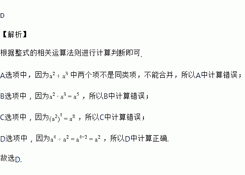 A. a2+a3=a5 B. a2•a3=a6 C. (a2)4 = a6 D. a4÷a2=a2