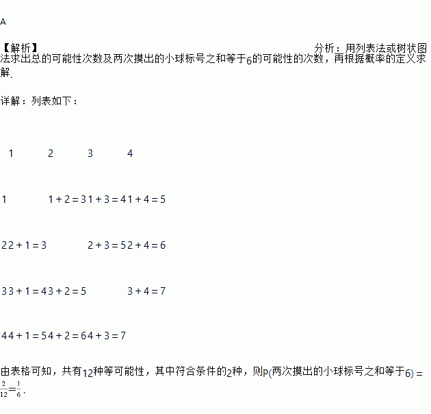 一个不透明的口袋中有四个完全相同的小球,把它们分别标号为1,2,3,4,随机摸出一个小球后不放回,再随机摸出一个小球,则两次摸出的小球标号之和等于6的概率为( )