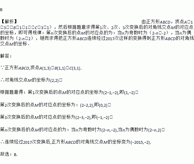 B 【解析】由正方形ABCD,顶点A(1,3)、B(1,1)、C(3,1),然后根据题意求得第1次、2次、3次变换后的对角线交点M的对应点的坐标,即可得规律:第n次变换后的点M的对应点的为:当n为奇数时为(2-n,-2),当n为偶数时为(2-n,2),继而求得把正方形ABCD连续经过2017次这样的变换得到正方形ABCD的对角线交点M的坐标. 解答: ∵正方形ABCD,顶点A(1...