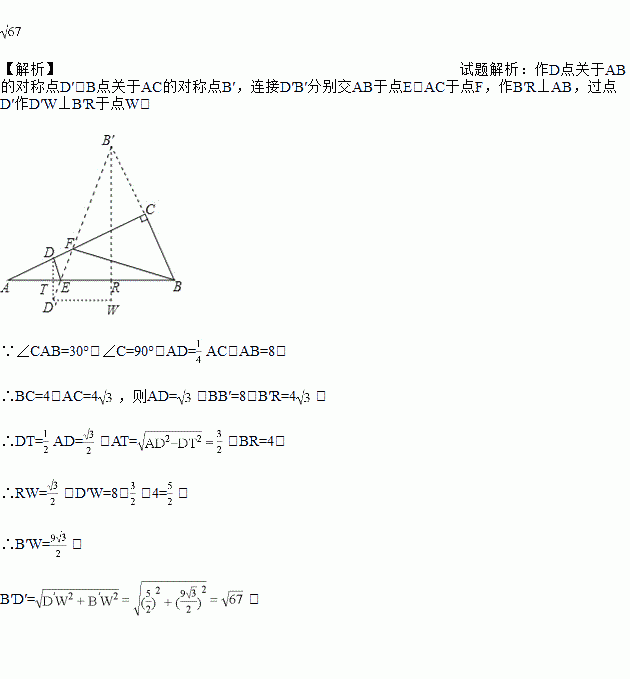 如图,在Rt△ABC中,∠CAB=30°,∠C=90°.AD=AC,AB=8,E是AB上任意一点,F是AC上任意一点,则折线DEFB的最短长度为_____.