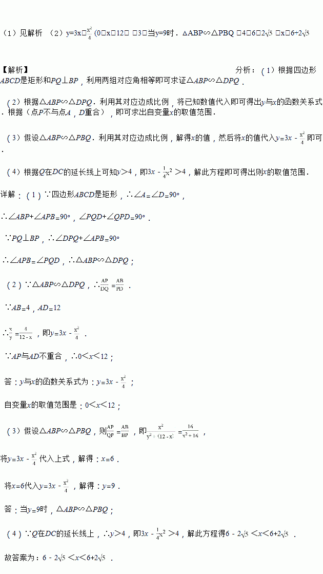 已知:如图,矩形ABCD中AB=4,AD=12,点P是线段AD上的一动点(点P不与点A,D重合),点Q是直线CD上的一点,且PQ⊥BP,连接BQ,设AP=x,DQ=y.