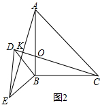 (2)将图1中的直角△DBE绕点B逆时针旋转一个锐角,如图2所示,问图2中线段AE,CD的数量关系和位置关系还成立吗?若成立,请给予证明;若不成立,请说明理由.