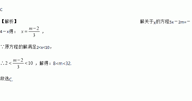 关于x的方程5x-2m=-4-x的解满足2<x<10,则m的取值范围是 ( )