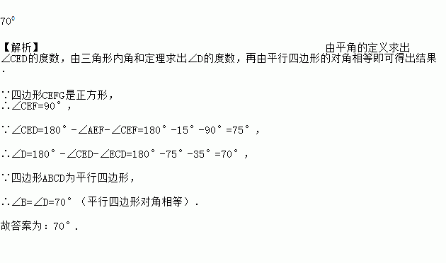 如图,已知□ABCD和正方形CEFG有一个公共的顶点C,其中E点在AD上,若∠ECD=35°,∠AEF=15°,则∠B的度数是_________.