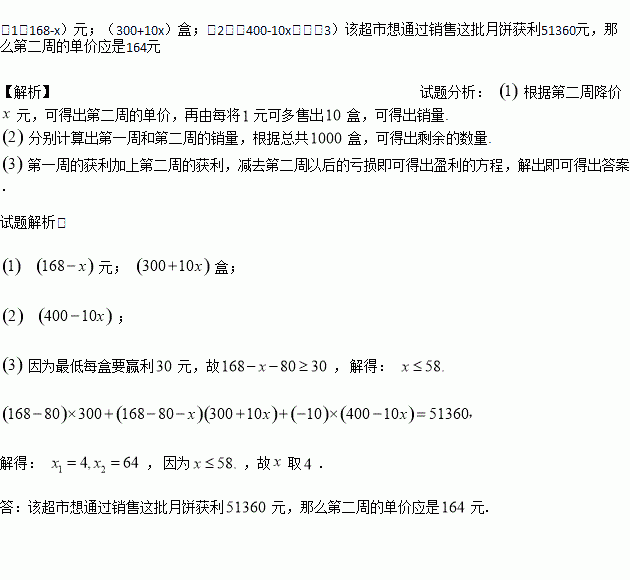 2017年中秋节来期间,某超市以每盒80元的价格购进了1000盒月饼,第一周以每盒168元的价格销售了300盒,第二周如果单价不变,预计仍可售出300盒,该超市经理为了增加销量,决定降价,据调查,单价每降低1元,可多售出10盒,但最低每盒要赢利30元,第二周结束后,该超市将对剩余的月饼一次性赔钱甩卖,此时价格为70元/盒.