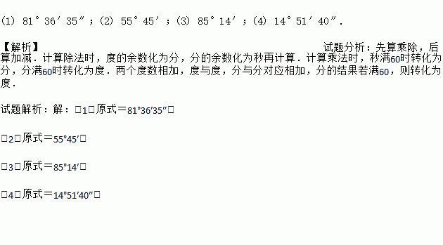 (1) 81°36′35″;(2) 55°45′;(3) 85°14′;(4) 14°51′40″. 【解析】试题分析:先算乘除,后算加减.计算除法时,度的余数化为分,分的余数化为秒再计算.计算乘法时,秒满60时转化为分,分满60时转化为度.两个度数相加,度与度,分与分对应相加,分的结果若满60,则转化为度. 试题解析:【解析】 (1)原式=81°36′35″. (2)原式=5...