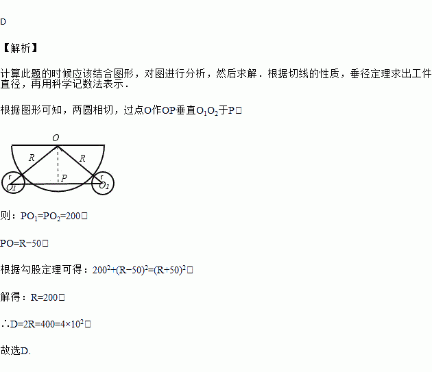 如图,在平台上用直径为100mm的两根圆钢棒嵌在大型工件的两侧,测量大的圆形工件的直径D,测得两根圆钢棒与地的两个接触点之间的距离为400mm,则工件直径D(mm)用科学记数法可表示为( )mm.